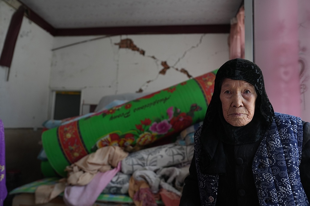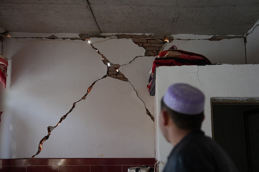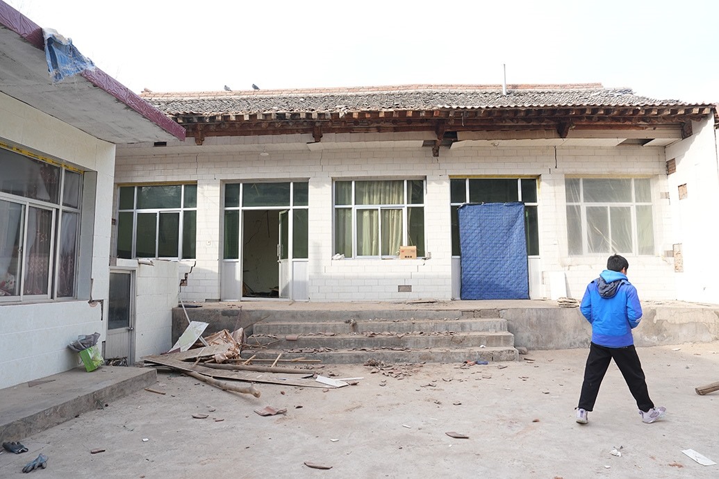 12月23日當天,馬國忠和叔叔伯伯兩家都在家門前搭起剛領的帳篷。叔叔馬進明家受損嚴重,兩堵磚墻的銜接處完全開裂,像條拉鏈被猛地拽下;天花板掉了大半,木頭架構的屋頂赫然露在豁口里。所幸,他和家人平時在縣城租房住。