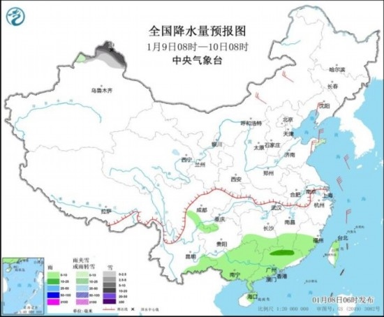 1月9日08時至10日08時,新疆西北部有小到中雪或雨夾雪,部分地區(qū)有大雪或暴雪(10~19毫米)。四川盆地南部、云南東南部、江南南部、華南大部等地部分地區(qū)有小到中雨。內(nèi)蒙古中東部、遼寧、山東半島等地部分地區(qū)有4~5級風。東海南部海域將有6~7級風,陣風8級。