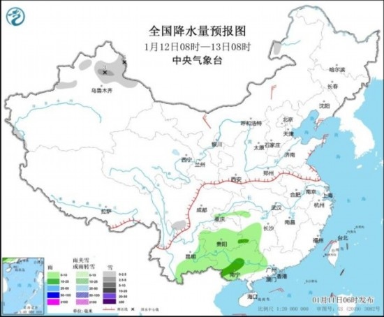 全國降水量預(yù)報圖(1月12日08時-13日08時)