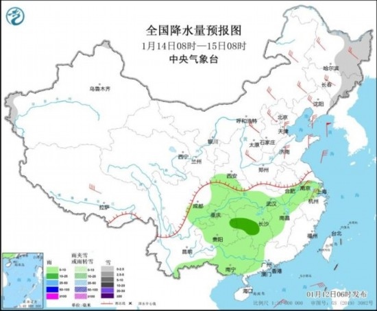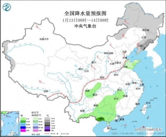 全國(guó)降水量預(yù)報(bào)圖(1月12日08時(shí)-13日08時(shí))