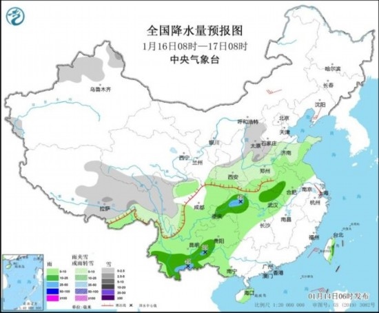 全國(guó)降水量預(yù)報(bào)圖(1月14日08時(shí)-15日08時(shí))