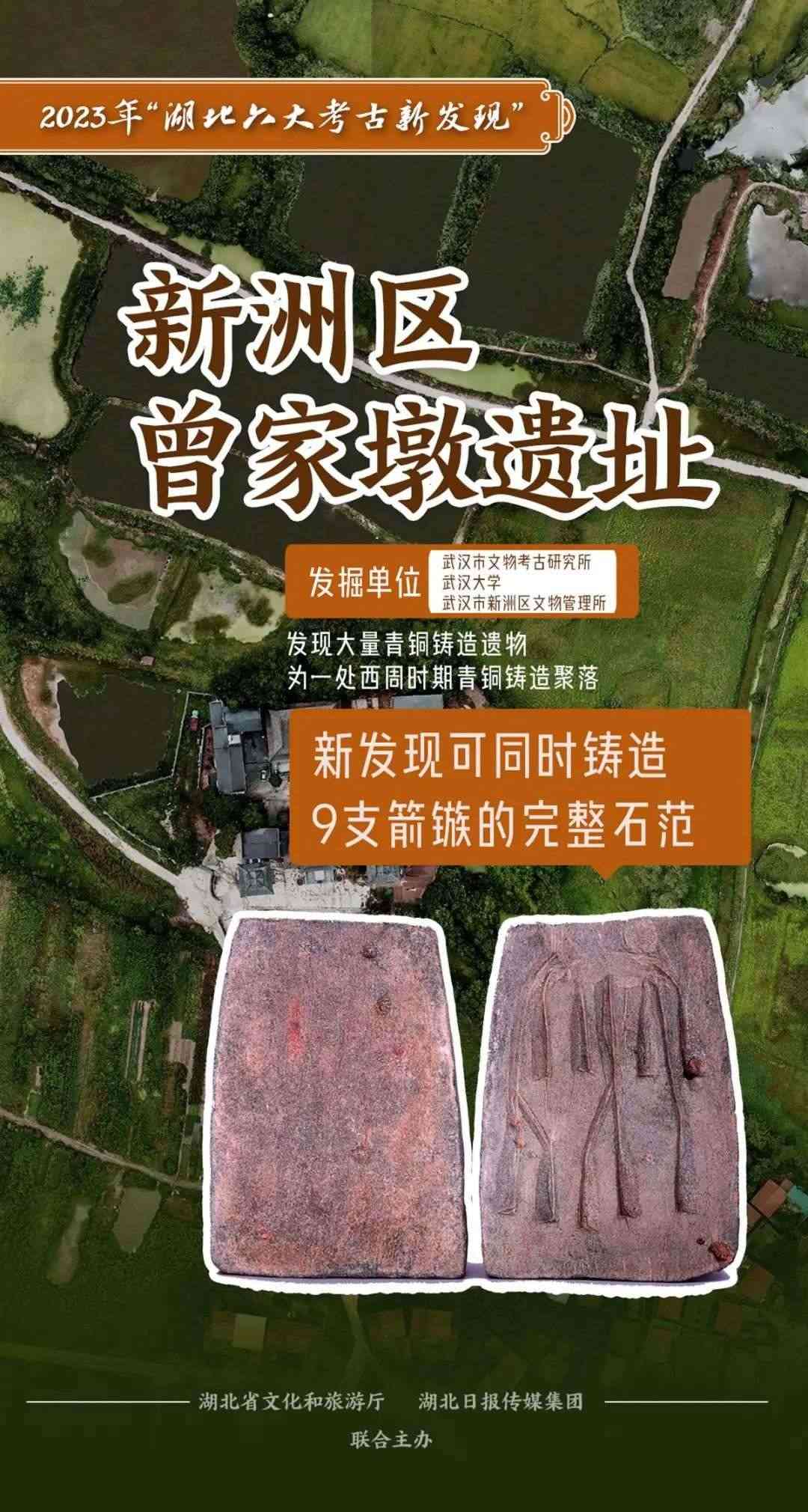 繼武漢黃陂盤龍城遺址小嘴遺址點、郭元咀遺址發(fā)現(xiàn)商代鑄銅遺存后,考古工作者在新洲曾家墩遺址新發(fā)現(xiàn)西周時期青銅鑄造遺存。遺址出土一塊用于鑄造青銅箭鏃的石范(即鑄造青銅器的石質模具),保存完好,其完整程度在此前湖北地區(qū)考古中未曾發(fā)現(xiàn)。這塊石范可同時鑄造9支青銅箭鏃,具有相當高的工藝水平。