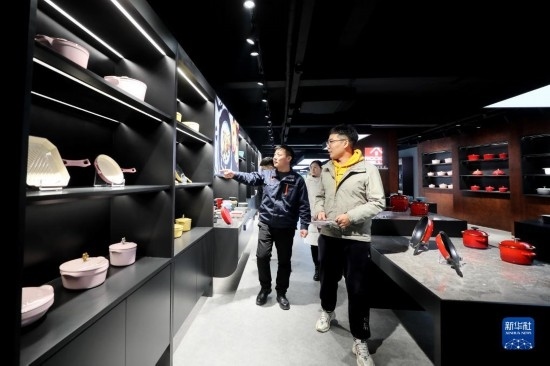 12月21日,在位于隆堯縣的河北三廈廚具科技有限公司產(chǎn)品展廳,工作人員在為客戶介紹廚具產(chǎn)品。