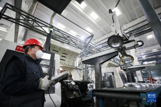 12月21日,在位于隆堯縣的河北遠大閥門集團有限公司鍛鋼高端定制車間,工人操控智能設備加工閥門產(chǎn)品。