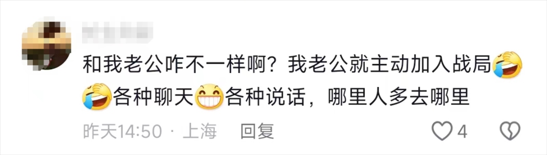 有的“社牛”女婿選擇主動加入戰(zhàn)局,哪里人多去哪里,各種聊天,積極融入。