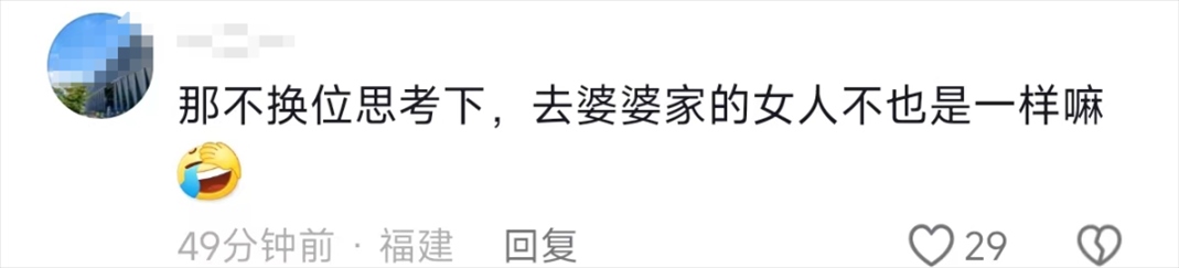 還有網(wǎng)友表示,這個時候,女婿更應該能過體諒媳婦在婆家過年的難處了,大家過年要互相體諒,換位思考。