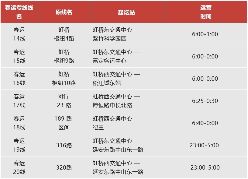 注:虹橋樞紐春運專線運營日期為2月14日至3月5日。