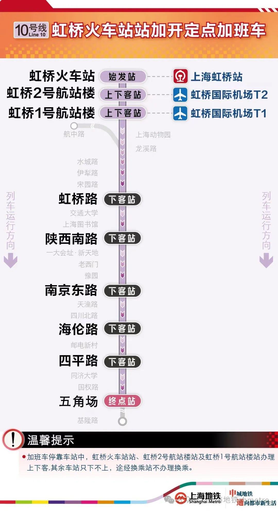 今日,10號線虹橋火車站加班車延長至2月18日2:30。其中,10號線虹橋火車站站往五角場站方向定點(diǎn)加班車沿途僅??亢鐦蚧疖囌菊尽⒑鐦?號航站樓站、虹橋1號航站樓站、虹橋路站、陜西南路站、南京東路站、海倫路站、四平路站、五角場站,其余車站跳停。停靠車站中,虹橋火車站站、虹橋2號航站樓站、虹橋1號航站樓站可同時(shí)上下客,其余車站只下不上,途經(jīng)換乘站不可換乘。