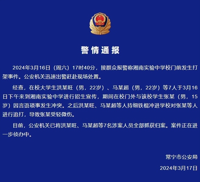 ·多人持棍沖進學(xué)校追打中學(xué)生,湖南常寧警方通報:7名涉案人員已全部抓獲歸案。