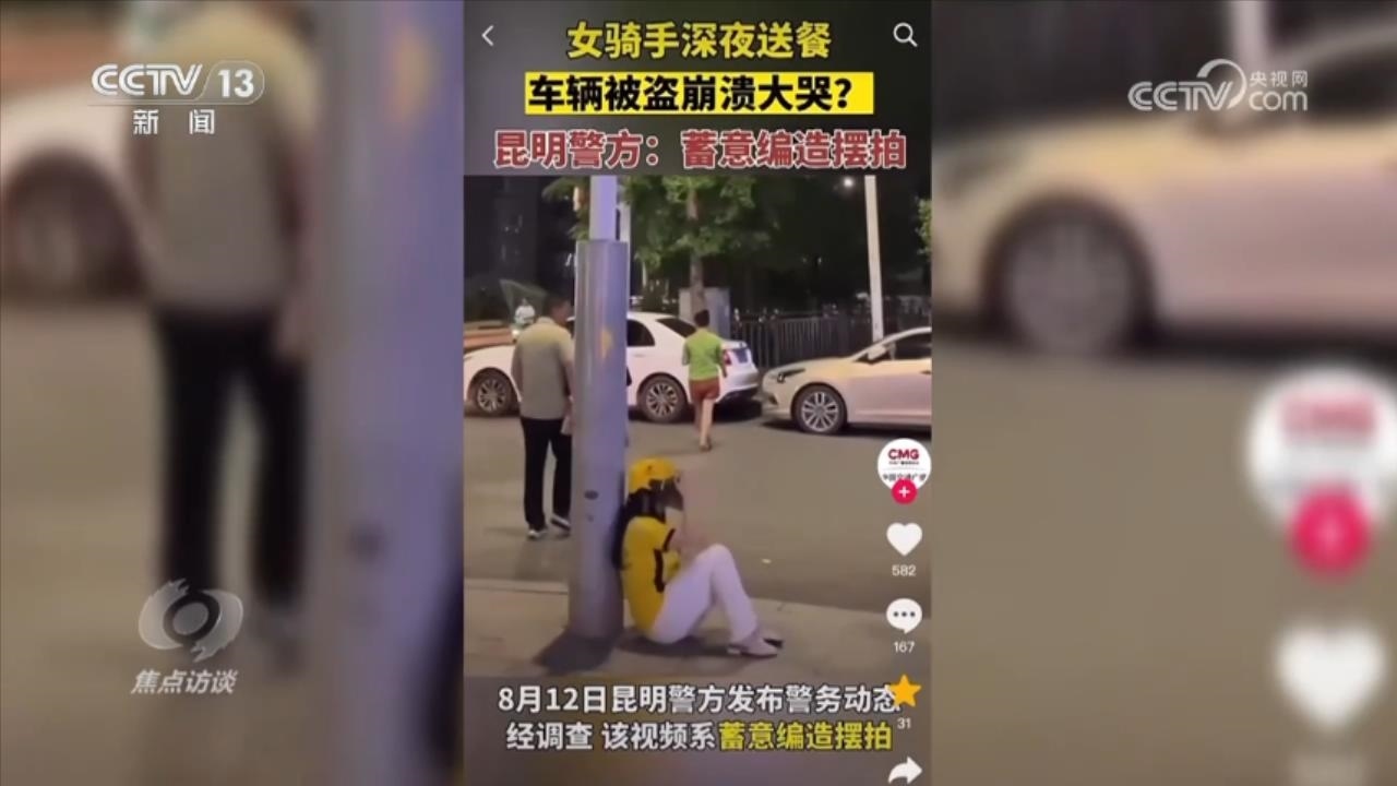 2023年8月3日,某網絡平臺發(fā)布了一個短視頻,除了哭泣聲,上面文字打的是“深夜,外賣姐姐送餐,下樓發(fā)現(xiàn)車被偷了”。然而,就是這樣一個時長僅10秒左右的視頻,當晚瀏覽量已超6000萬次,并在多個平臺迅速傳播,進入熱榜,隨即點贊、收藏量超過10萬次。同樣,這些也引起了警方的關注,經調查核實,該視頻為擺拍,發(fā)布者就是畫面中表演的女子,其丈夫在旁負責道具和指導。而他們當時擺拍的全過程被大街上的戶外監(jiān)控記錄了下來。