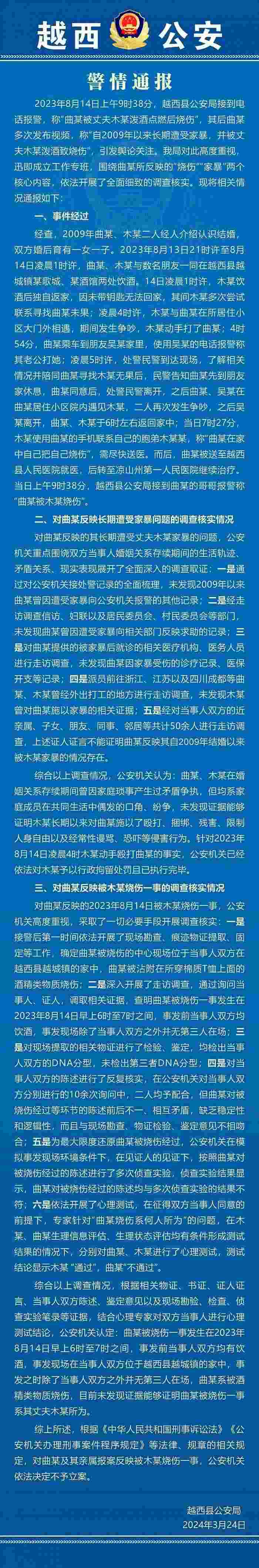 3月24日,越西縣公安局對此發(fā)布警情通報(bào)稱,綜合調(diào)查情況,根據(jù)相關(guān)物證、書證、證人證言、當(dāng)事人雙方陳述、鑒定意見以及現(xiàn)場勘驗(yàn)、檢查、偵查實(shí)驗(yàn)筆錄等證據(jù),結(jié)合心理專家對雙方當(dāng)事人進(jìn)行心理測試結(jié)論,公安機(jī)關(guān)認(rèn)定:曲某被燒傷一事發(fā)生在2023年8月14日早上6時至7時之間,事發(fā)前當(dāng)事人雙方均有飲酒,事發(fā)現(xiàn)場在當(dāng)事人雙方位于越西縣越城鎮(zhèn)的家中,事發(fā)之時除了當(dāng)事人雙方之外并無第三人在場,曲某系被酒精類物質(zhì)燒傷,目前未發(fā)現(xiàn)證據(jù)能夠證明曲某被燒傷一事系其丈夫木某所為。警方表示,對曲某及其親屬報(bào)案反映被木某燒傷一事,公安機(jī)關(guān)依法決定不予立案。