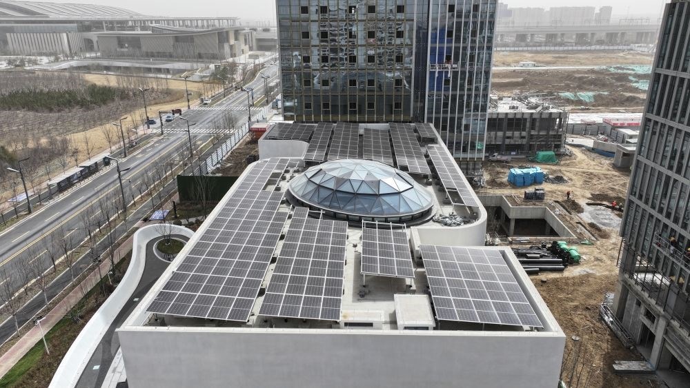 ↑雄安自貿(mào)試驗(yàn)區(qū)交流展示中心是首批通過新區(qū)專家評(píng)審的零碳示范建筑,這是該中心屋頂?shù)墓夥l(fā)電設(shè)施(3月28日攝,無人機(jī)照片)。