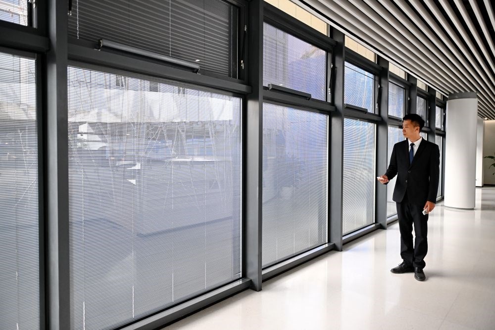 ↑3月28日,雄安自貿(mào)試驗(yàn)區(qū)交流展示中心的工作人員在展示兼具保溫與遮陽(yáng)效果的鍍膜玻璃,該中心是首批通過新區(qū)專家評(píng)審的零碳示范建筑。