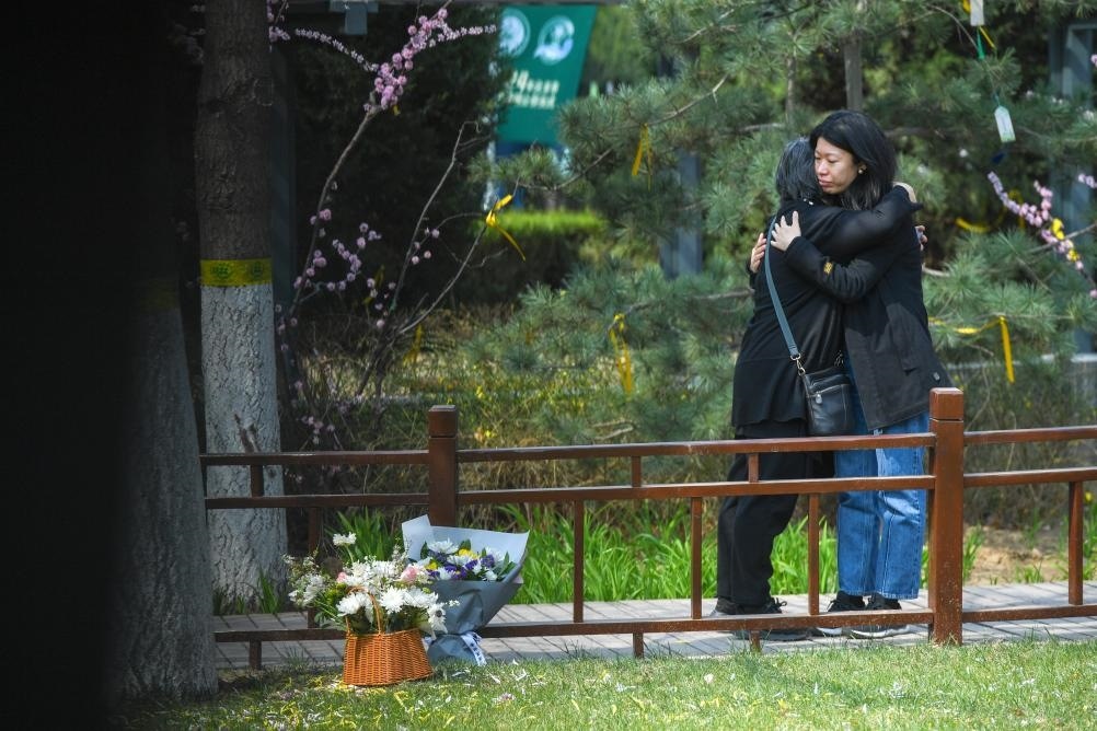 4月2日,在北京長青生命紀念園自然葬區(qū),自然葬逝者家屬在安放花束、祭奠親人后相擁。新華社記者 鞠煥宗 攝
