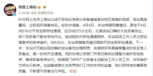 央視網(wǎng)消息:據(jù)@鐵路上海站 消息,針對(duì)網(wǎng)上流傳上海站北進(jìn)廳安檢處有部分旅客情緒激動(dòng)相互推搡的視頻,車站高度重視,立即組織調(diào)查核實(shí)。經(jīng)初步調(diào)查,4月4日,車站根據(jù)預(yù)售情況,原定于4日6時(shí)30分開啟全部安檢通道,當(dāng)日6時(shí)25分左右,北面進(jìn)站口瞬時(shí)大批旅客到達(dá),因個(gè)別旅客不配合安檢作業(yè),造成短時(shí)內(nèi)安檢通道擁擠,車站現(xiàn)場(chǎng)工作人員立即加強(qiáng)宣傳和秩序維護(hù)。6時(shí)28分,車站根據(jù)客流情況提前開啟全部安檢通道。下一步,車站對(duì)可能出現(xiàn)的瞬時(shí)進(jìn)站客流加強(qiáng)預(yù)想,合理做好早高峰等重點(diǎn)時(shí)段應(yīng)急人員備崗,第一時(shí)間開足通道。同時(shí)協(xié)調(diào)公安部門節(jié)假日期間加強(qiáng)警力維護(hù)安檢秩序,確保旅客有序出行。鐵路部門呼吁廣大旅客主動(dòng)配合工作人員工作,共同維護(hù)文明出行秩序,也誠摯感謝社會(huì)各界對(duì)其工作的支持和監(jiān)督,將持續(xù)改善服務(wù)質(zhì)量,不斷提升旅客出行體驗(yàn)。