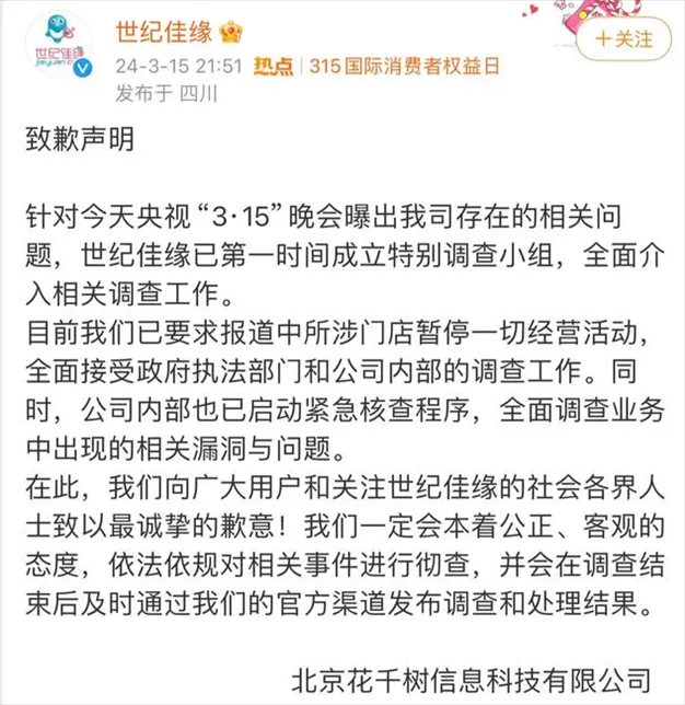 值得一提的是,今年央視3·15晚會(huì)曝光珍愛網(wǎng)、世紀(jì)佳緣、戀愛課等多家婚戀平臺(tái)涉嫌用優(yōu)質(zhì)的異性資源、0門檻的誘人廣告、言之鑿鑿的成功案例作為噱頭,欺騙消費(fèi)者。對(duì)此,世紀(jì)佳緣致歉稱,第一時(shí)間成立特別調(diào)查小組,全面介入相關(guān)調(diào)查工作。目前公司已要求報(bào)道中所涉門店暫停一切經(jīng)營(yíng)活動(dòng),全面接受政府執(zhí)法部門和公司內(nèi)部的調(diào)查工作。同時(shí),公司內(nèi)部也已啟動(dòng)緊急核查程序,全面調(diào)查業(yè)務(wù)中出現(xiàn)的相關(guān)漏洞與問題。珍愛網(wǎng)官方微博發(fā)布致歉聲明,稱在第一時(shí)間成立專項(xiàng)小組,采取最嚴(yán)措施,全面深入調(diào)查并立即處理相關(guān)問題。
