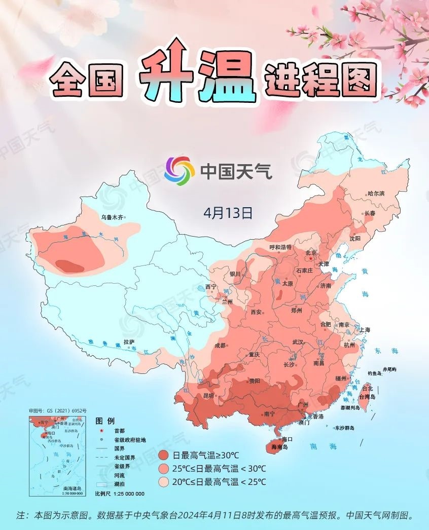 眼下,全國大部處于冷空氣影響間歇期,升溫是主旋律。預計今起三天(4月11日至13日),我國從北到南都將開啟回暖進程,最高氣溫25℃以上的區(qū)域幾乎覆蓋整個中東部,波及20余省份,東北、西北地區(qū)氣溫將大面積創(chuàng)今年以來新高,北方不少地方還會體驗到常年5月中旬才有的超前暖熱。中國天氣網(wǎng)推出全國升溫進程圖,看看哪些地方將沖擊30℃。