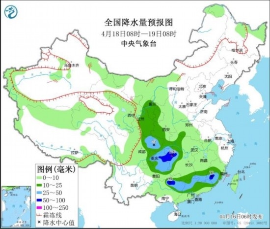 4月16日08時至17日08時,四川盆地東部、重慶大部、貴州東部、湖北中南部、湖南大部、江西中北部、福建中北部、浙江大部以及伊犁河谷等地部分地區(qū)有中到大雨,其中,湖南東部、江西中北部、福建西北部、重慶北部、湖北西南部等地的部分地區(qū)有暴雨,局地大暴雨(100~140毫米)。內蒙古中部、遼寧西部、新疆東部、西藏南部、甘肅河西、山東半島等地部分地區(qū)有4~6級風。