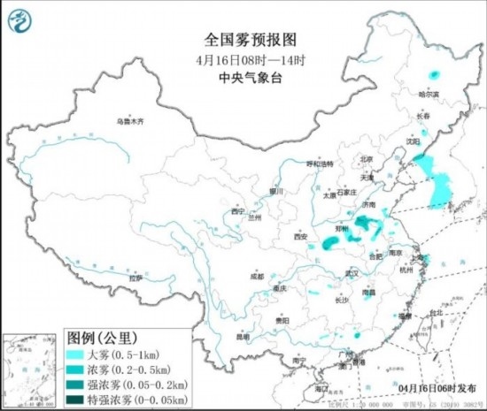 預計,4月16日早晨至上午,黃海東北部和中東部海域、浙江東北部沿岸的部分海域將有能見度不足1公里的大霧,此外,山東南部、河南東部和南部、江蘇北部、安徽北部、湖北西北部、浙江東部、福建東部、湖南北部、江西北部、廣東北部、遼寧東部等地的部分地區(qū)有大霧,其中河南南部、山東南部、安徽北部、浙江東部沿海局地有能見度不足200米的強濃霧。中央氣象臺4月16日06時繼續(xù)發(fā)布大霧黃色預警。