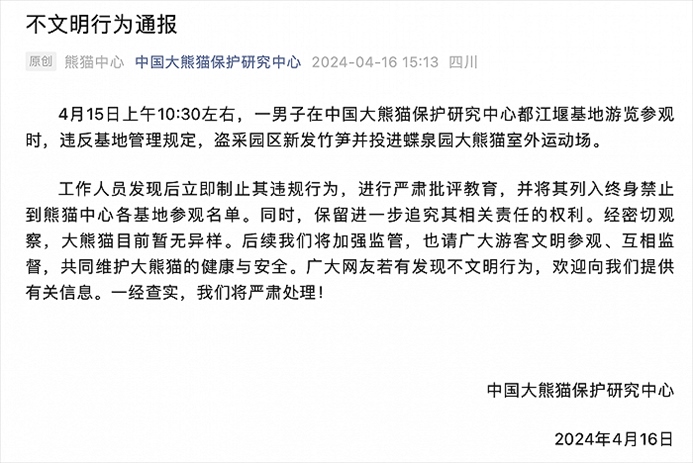 央視網(wǎng)消息:4月16日,中國(guó)大熊貓保護(hù)研究中心發(fā)布不文明行為通報(bào):4月15日上午10:30左右,一男子在中國(guó)大熊貓保護(hù)研究中心都江堰基地游覽參觀時(shí),違反基地管理規(guī)定,盜采園區(qū)新發(fā)竹筍并投進(jìn)蝶泉園大熊貓室外運(yùn)動(dòng)場(chǎng)。