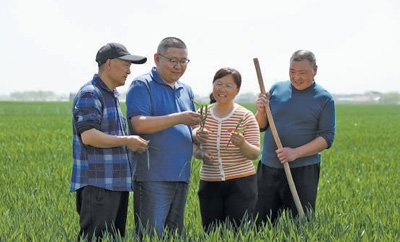 蘇丹(中)在指導(dǎo)村民進(jìn)行小麥揚(yáng)花期田間管理。本報(bào)記者 原韜雄攝