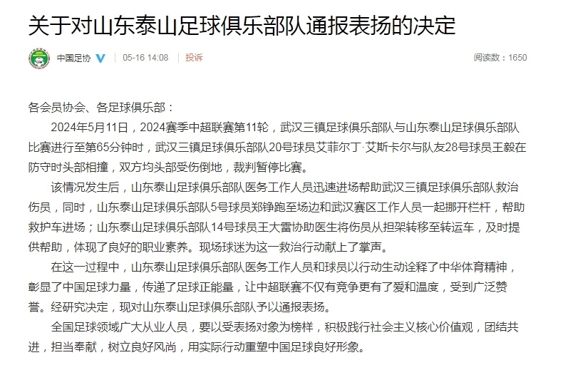 ·幫助救治武漢三鎮(zhèn)足球俱樂部隊(duì)傷員,中國(guó)足協(xié)通報(bào)表?yè)P(yáng)山東泰山俱樂部。