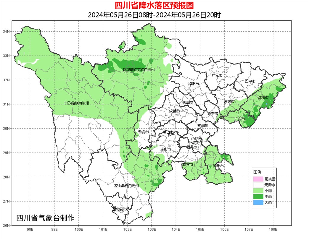 明天白天:盆地大部多云間晴,其中達州、廣安、瀘州3市有陣雨或雷雨;阿壩州大部、甘孜州北部東部、涼山州東北部多云間陰有分散陣雨或雷雨,其中阿壩州北部有中雨,甘孜州和攀西地區(qū)的其余地方多云間晴。