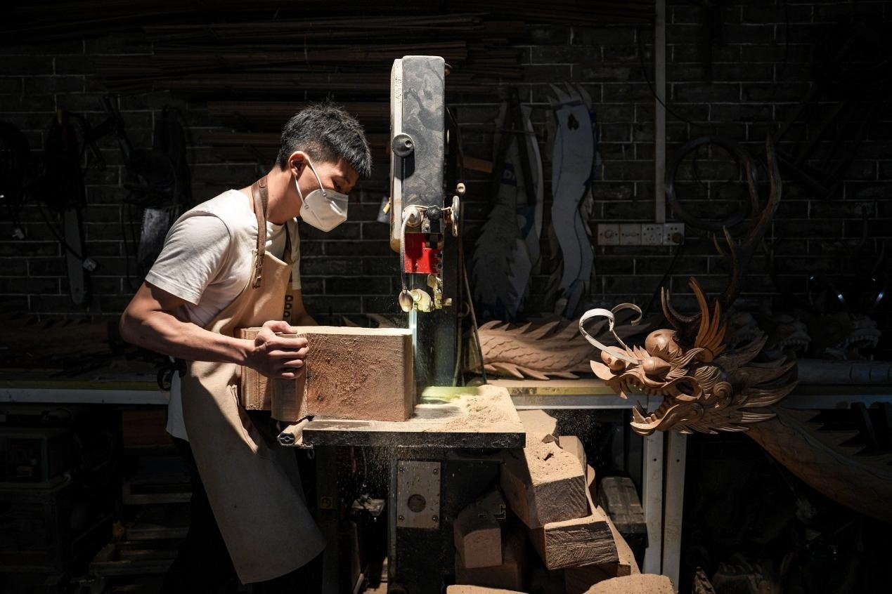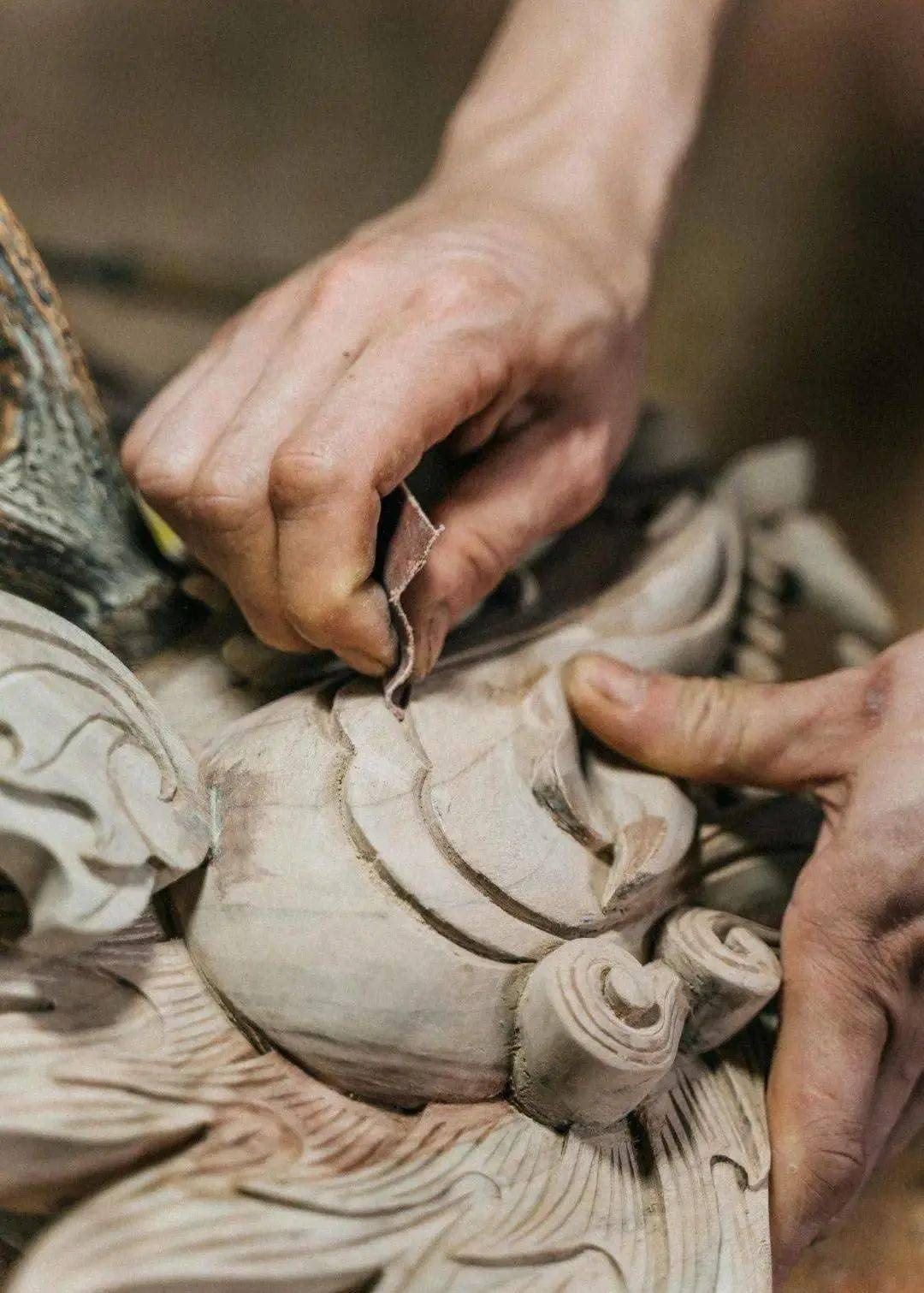 張偉潮身上的傷也沒斷過?!疤焯旄洞蚪坏?,有時候傷口剛縫了線,回到家一干活,刀口又開了”,手臂上、手背上遍布的傷疤,見證了每一個龍頭的誕生?!懊肯乱坏?,我都已經想好了后面的第二步、第三步”,龍頭雕刻極為考究,從選料、切割,到粗雕、精雕,再到打磨、拋光、裱漆,十幾道繁瑣工序,全靠師傅的眼光和手藝。機械化、流水線,做不出龍頭嗎?在數不清的日夜里,光影斑駁間,張偉潮拿著父輩傳下的一刀一錘,一下一下,慢慢開鑿,給出自己的答案。
