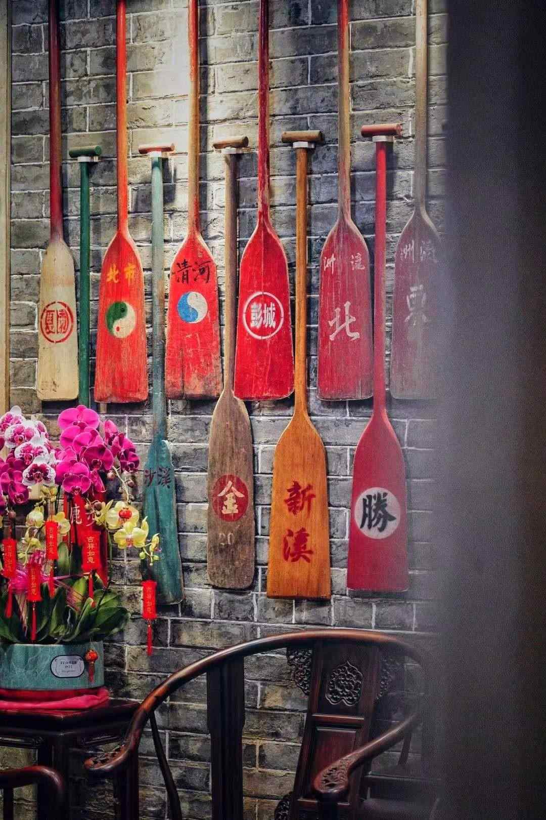 在張偉潮工作室的青磚墻上掛滿了劃龍舟所用的船槳?!皝砣↓堫^的人大多會送一面錦旗,我說不要錦旗,可以把你們不用的槳送給我。”這些年張偉潮陸續(xù)收到了300多支船槳,在他看來,每一把槳都蘊含著自己隊伍、村落的故事,每一把都是獨一無二的,他要把船槳當作錦旗一樣高高地掛在墻上。