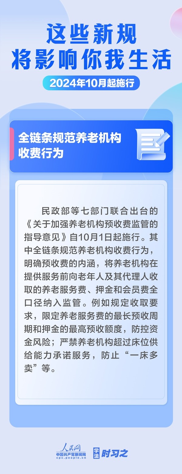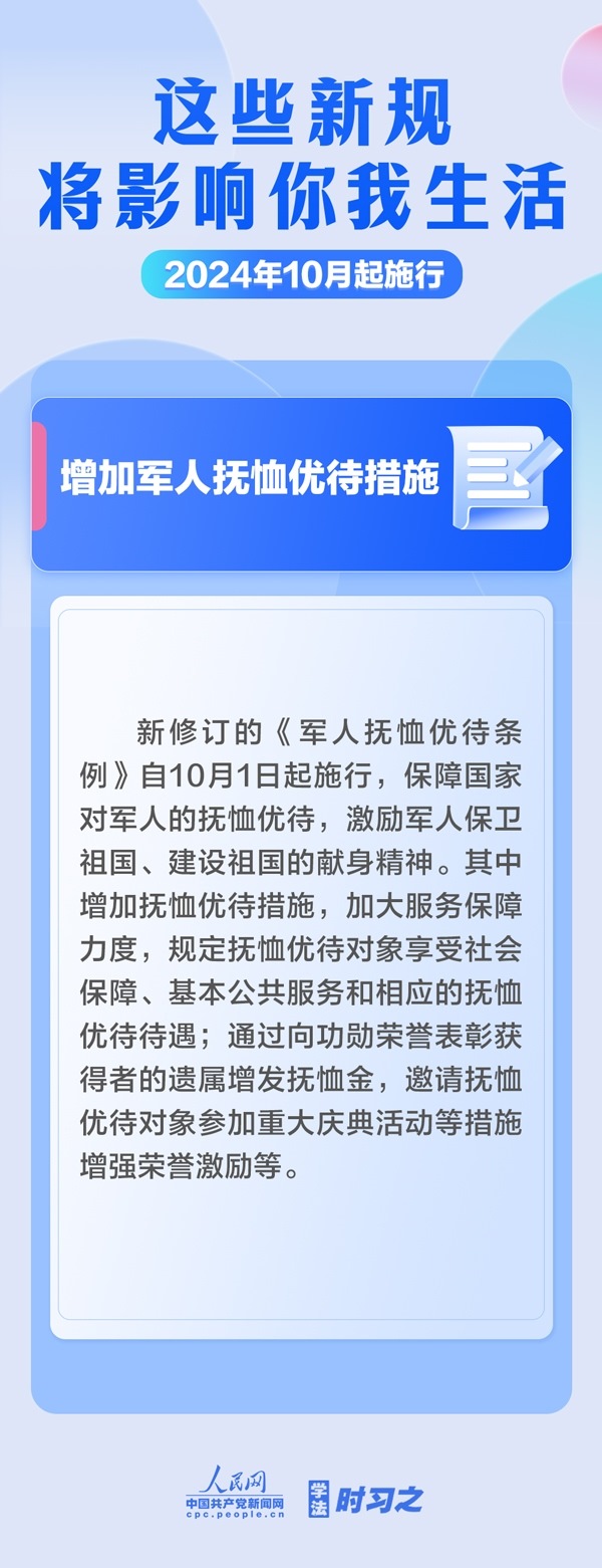 增加軍人撫恤優(yōu)待措施;全鏈條規(guī)范養(yǎng)老機(jī)構(gòu)收費(fèi)行為;電動自行車用鋰電池實施強(qiáng)制性產(chǎn)品認(rèn)證……10月起,這些新規(guī)施行,將影響你我生活。