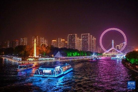 8月10日,游客乘坐海河游船游覽天津夜景。