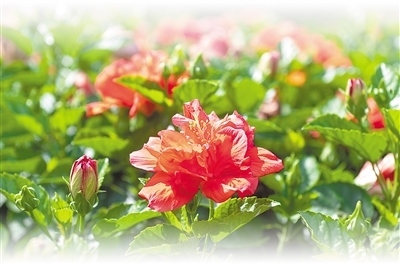 疑若焰生、朝開暮落的朱槿花,在我國古代文學記載中非常豐富,被賦予了深厚的人文內(nèi)涵?!罢螣熼L暖無霜雪,槿艷繁花滿樹紅。每嘆芳菲四時厭,不知開落有春風?!碧拼娙死罴澗驮谠娭匈潎@,“無霜雪”環(huán)境下生長的朱槿花四季常美。
