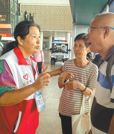 廣州南站的每個角落唐偉都了然于心。她已經(jīng)在這里服務(wù)超過13個年頭,是志愿服務(wù)隊里年紀(jì)最大的一名“銀發(fā)”志愿者,人們親切地稱呼她為“唐姨”。