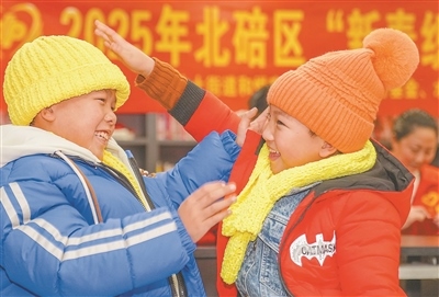 重慶市北碚區(qū)水土街道和悅家園社區(qū),困境兒童穿戴著志愿者贈(zèng)送的帽子和圍巾在玩耍。