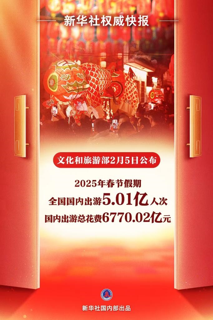 文化和旅游部2月5日公布2025年春節(jié)假期文化和旅游市場情況。經(jīng)文化和旅游部數(shù)據(jù)中心測算,春節(jié)假期8天,全國國內(nèi)出游5.01億人次,同比增長5.9%;國內(nèi)出游總花費6770.02億元,同比增長7.0%。