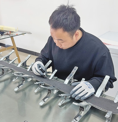 冰雪歡騰體育裝備科技(哈爾濱)有限公司內,工人為滑雪板底面邊刃涂膠加固。
