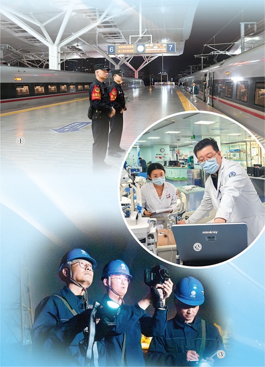 圖①:凌晨的長沙南站,鐘亞(左)和同事在執(zhí)勤。