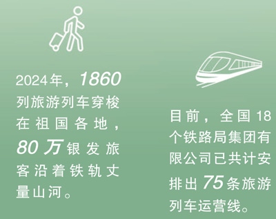 今年2月,商務(wù)部、文化和旅游部、中國國家鐵路集團有限公司等9單位聯(lián)合發(fā)布《關(guān)于增開銀發(fā)旅游列車促進服務(wù)消費發(fā)展的行動計劃》,指出要擴容旅游列車線路和產(chǎn)品,豐富銀發(fā)旅游列車產(chǎn)品供給,建立品質(zhì)型、舒適型、普惠型產(chǎn)品體系。目前,全國18個鐵路局集團有限公司已共計安排出75條旅游列車運營線。一趟趟銀發(fā)列車如春日繁花次第綻放,為老年人鋪就通往詩與遠方的旅途,更以流動的風景線激活沿線文旅消費,為推動經(jīng)濟高質(zhì)量發(fā)展注入“銀發(fā)”新動能。