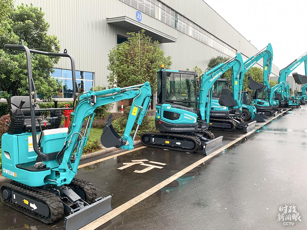 △這是不同型號的微型挖掘機,特點是動臂可偏轉(zhuǎn),底盤可伸縮,適合城市改造、農(nóng)田水利等小規(guī)模項目。(總臺央視記者章猛拍攝)