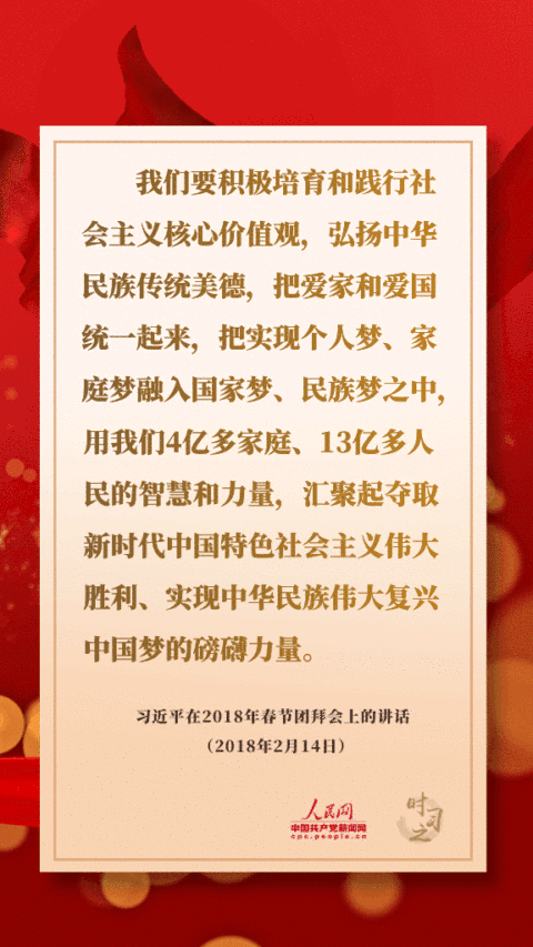 我們要積極培育和踐行社會(huì)主義核心價(jià)值觀,弘揚(yáng)中華民族傳統(tǒng)美德,把愛(ài)家和愛(ài)國(guó)統(tǒng)一起來(lái),把實(shí)現(xiàn)個(gè)人夢(mèng)、家庭夢(mèng)融入國(guó)家夢(mèng)、民族夢(mèng)之中,用我們4億多家庭、13億多人民的智慧和力量,匯聚起奪取新時(shí)代中國(guó)特色社會(huì)主義偉大勝利、實(shí)現(xiàn)中華民族偉大復(fù)興中國(guó)夢(mèng)的磅礴力量。