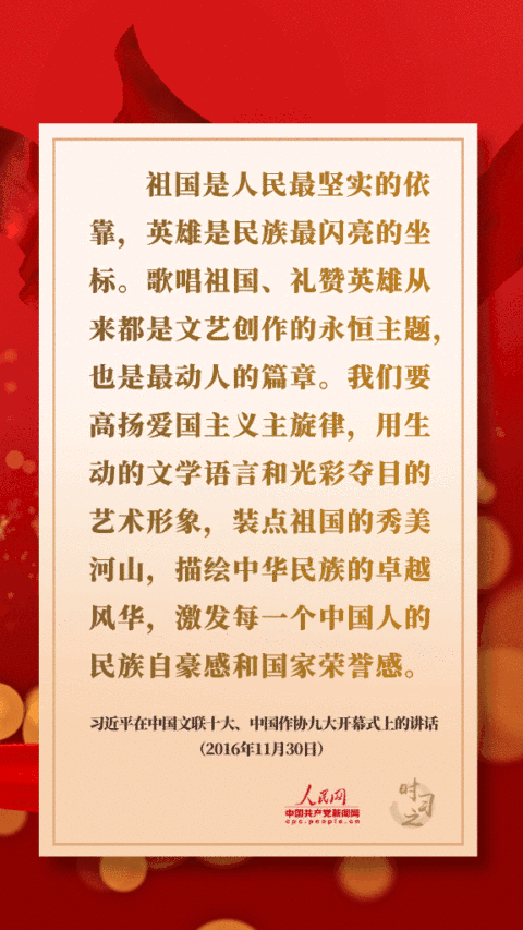 祖國(guó)是人民最堅(jiān)實(shí)的依靠,英雄是民族最閃亮的坐標(biāo)。歌唱祖國(guó)、禮贊英雄從來(lái)都是文藝創(chuàng)作的永恒主題,也是最動(dòng)人的篇章。我們要高揚(yáng)愛(ài)國(guó)主義主旋律,用生動(dòng)的文學(xué)語(yǔ)言和光彩奪目的藝術(shù)形象,裝點(diǎn)祖國(guó)的秀美河山,描繪中華民族的卓越風(fēng)華,激發(fā)每一個(gè)中國(guó)人的民族自豪感和國(guó)家榮譽(yù)感。