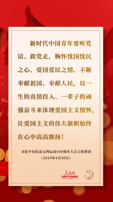 新時(shí)代中國(guó)青年要聽(tīng)黨話、跟黨走,胸懷憂國(guó)憂民之心、愛(ài)國(guó)愛(ài)民之情,不斷奉獻(xiàn)祖國(guó)、奉獻(xiàn)人民,以一生的真情投入、一輩子的頑強(qiáng)奮斗來(lái)體現(xiàn)愛(ài)國(guó)主義情懷,讓愛(ài)國(guó)主義的偉大旗幟始終在心中高高飄揚(yáng)!