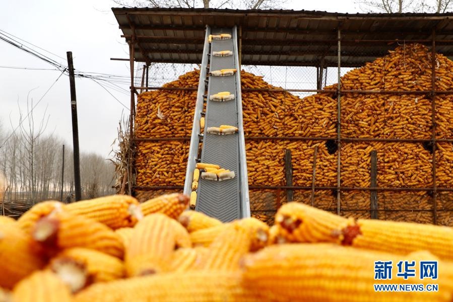 在哈爾濱市巴彥港鎮(zhèn)五星村農(nóng)民程顯義家院內(nèi),玉米通過傳送帶進入玉米架子(2020年11月3日攝)。新華社記者 徐凱鑫 攝