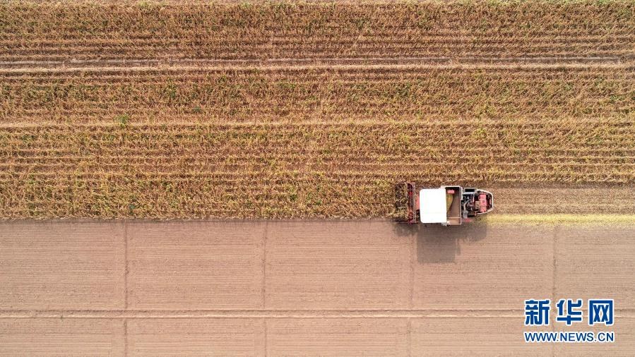 在河北省石家莊市藁城區(qū)梅花鎮(zhèn)朱家莊村的大豆田地里,農(nóng)戶駕駛農(nóng)機收割大豆(2020年10月10日攝,無人機照片)。新華社發(fā)(梁子棟 攝)