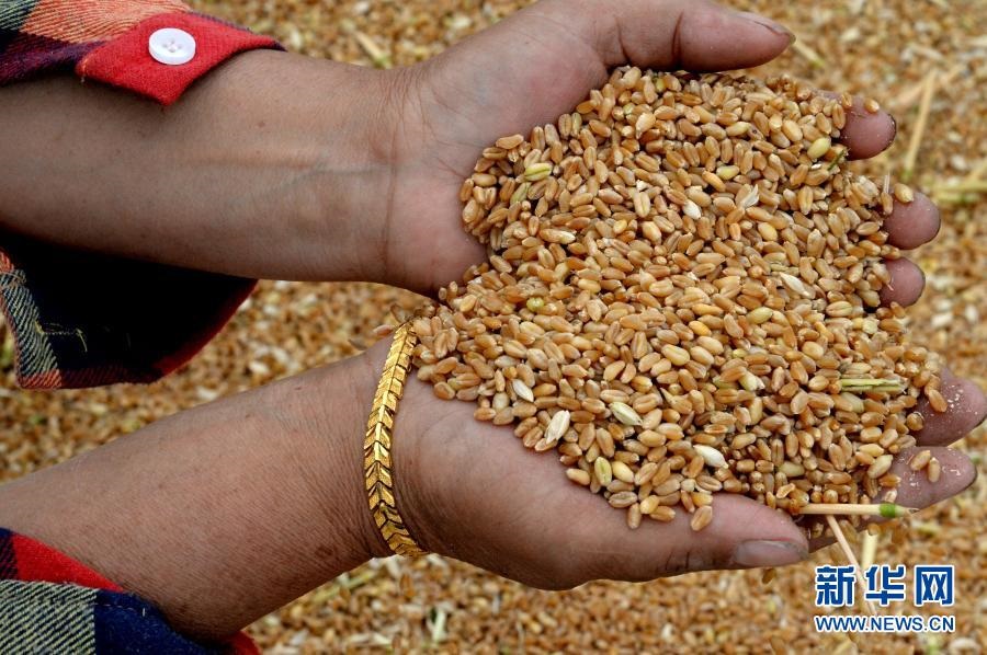 山東省滕州市東沙河鎮(zhèn)小宮山村村民在展示新收的“濟麥22”麥粒(2015年6月4日攝)。新華社記者 馮杰 攝