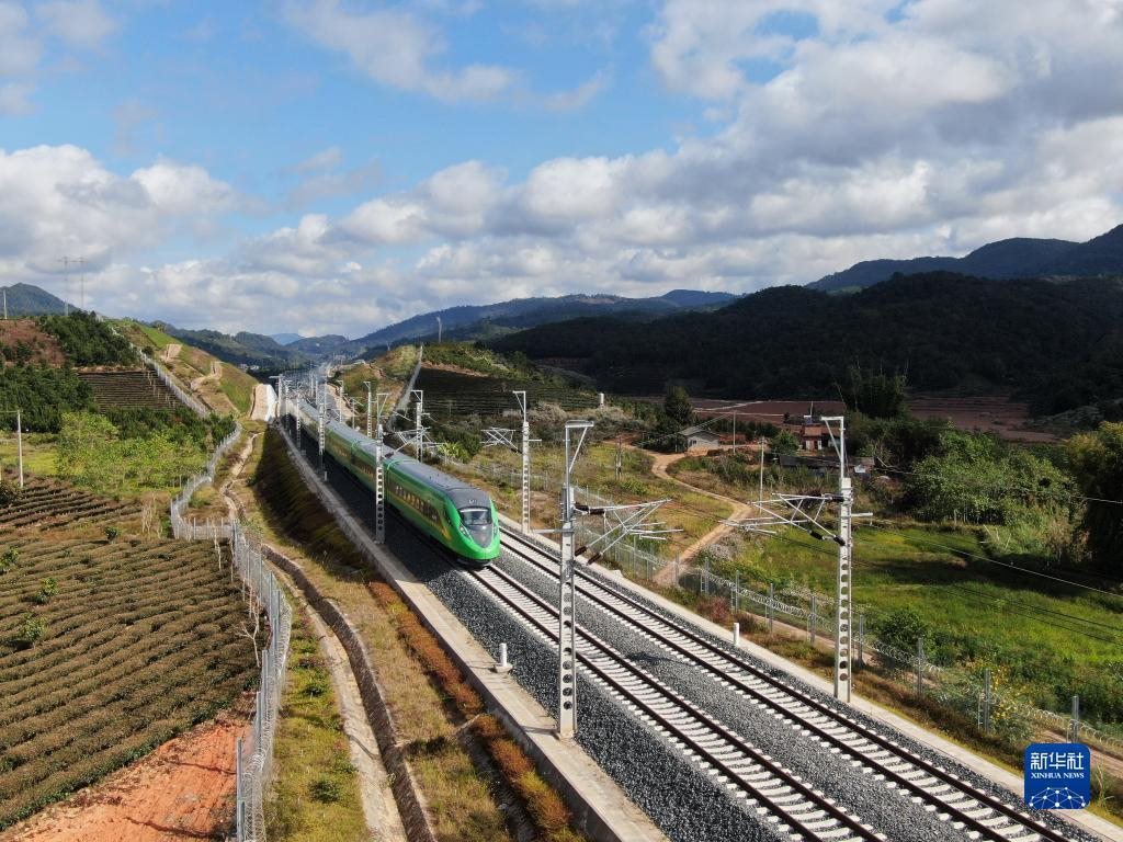 2022年1月3日,列車(chē)行駛在位于云南西雙版納傣族自治州景洪市境內(nèi)的中老鐵路上(無(wú)人機(jī)照片)。新華社發(fā)(李云生攝)
