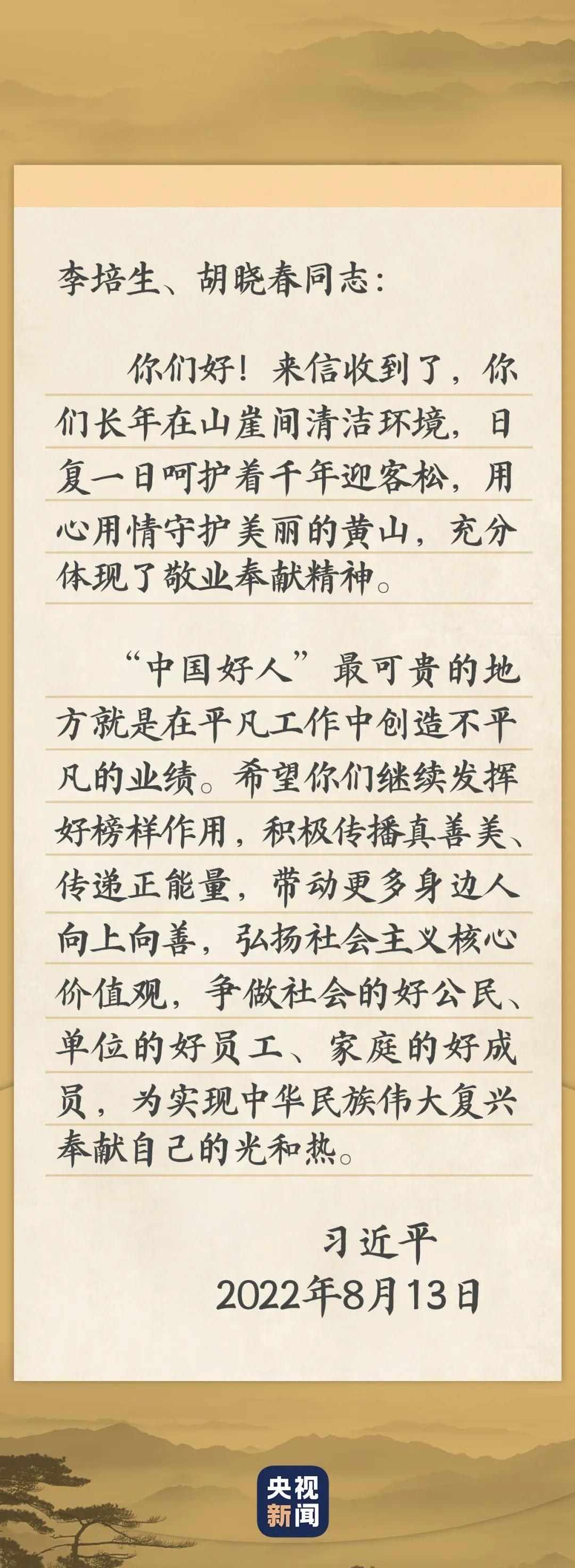 “真沒有想到習近平總書記給我們回信了,這份巨大的鼓舞不僅是給我們倆,也是給黃山的,更是給所有‘中國好人’的。”接到書信的李培生和胡曉春,前行的動力十足。