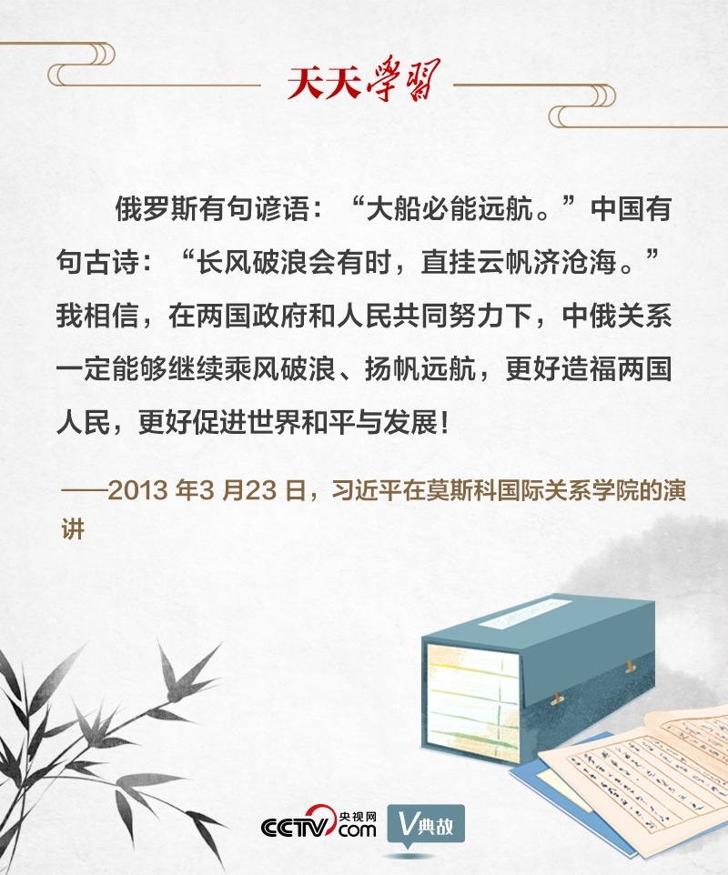 關(guān)于中俄關(guān)系,早在10年前在莫斯科國際關(guān)系學(xué)院的演講中,習(xí)近平主席就有精辟闡述。演講結(jié)束語中,習(xí)主席首先引用一句俄羅斯諺語“大船必能遠(yuǎn)航”,拉近了與俄羅斯民眾的文化空間和心理距離。接著引用了含義相近的中國古詩“長風(fēng)破浪會(huì)有時(shí),直掛云帆濟(jì)滄?!?,讓對方在文化相似性中深刻領(lǐng)悟其中道理。最后凝聚共同理念:“中俄關(guān)系一定能夠繼續(xù)乘風(fēng)破浪、揚(yáng)帆遠(yuǎn)航”。