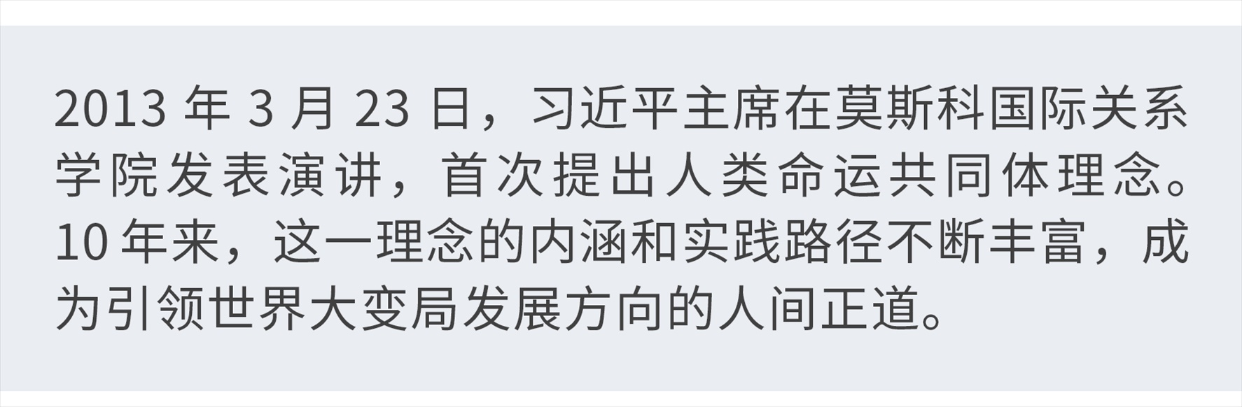 10年前,也是在早春時節(jié),習(xí)近平主席在莫斯科國際關(guān)系學(xué)院發(fā)表演講,首次提出人類命運共同體理念——“這個世界,各國相互聯(lián)系、相互依存的程度空前加深,人類生活在同一個地球村里,生活在歷史和現(xiàn)實交匯的同一個時空里,越來越成為你中有我、我中有你的命運共同體。”