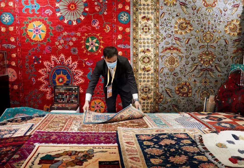 2021年11月8日,工作人員在進(jìn)博會(huì)阿富汗手工羊毛地毯展臺(tái)整理商品。